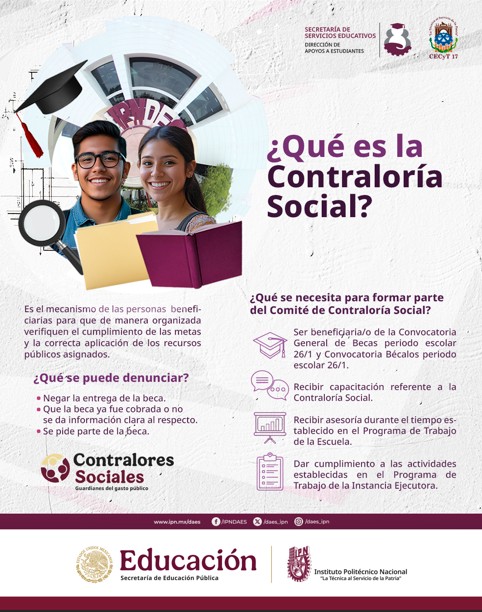 La Contraloría Social en el CECyT 17 León Gto. del IPN es un mecanismo de participación ciudadana que permite a las y los beneficiarios de los programas federales de desarrollo social vigilar que los recursos públicos se apliquen con transparencia, legalidad, eficacia, eficiencia, honradez y equidad.